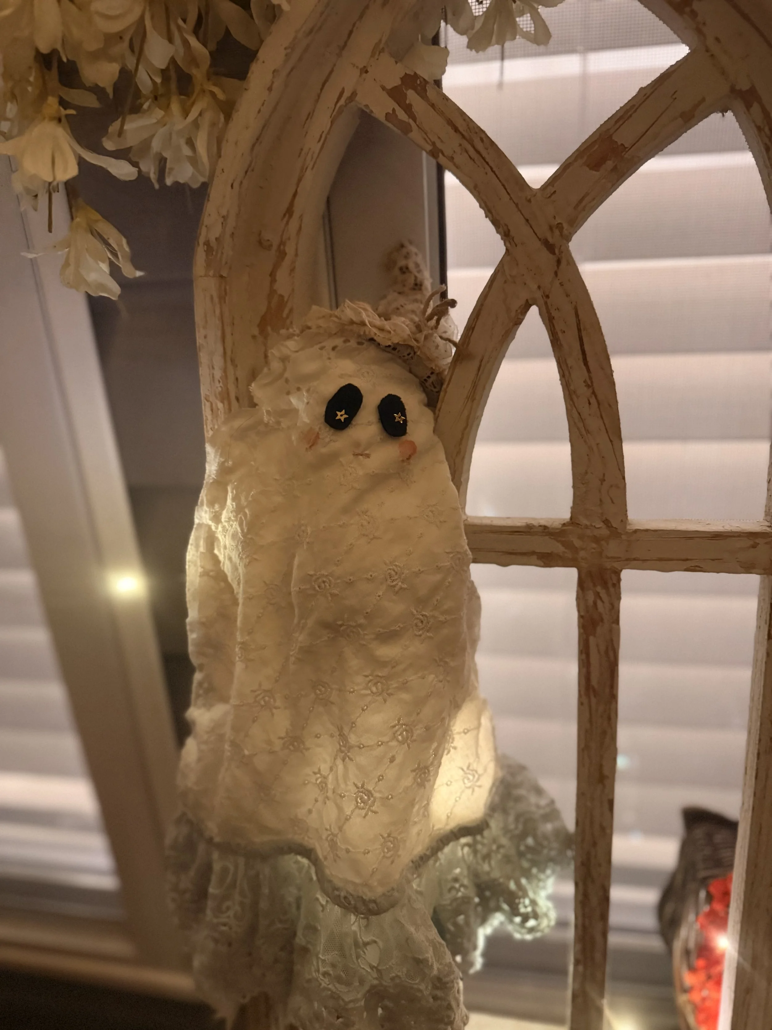 I even made my own ghosts using repurposed clothes I found there — I cut, frayed, and layered lace into spooky fringe, added little star eyes, and topped it with a mini witch hat that I made with repurposed lace. It turned out adorable and completely one-of-a-kind.