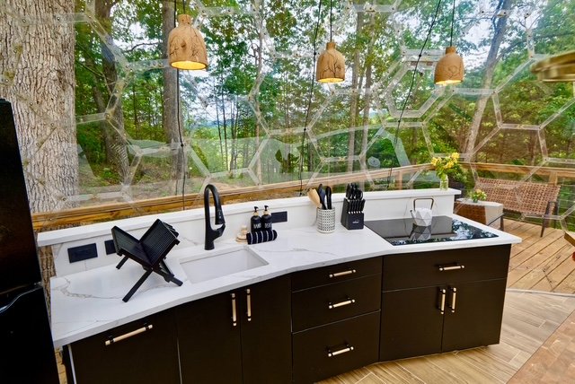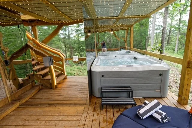 The Glassy Dome has a hidden staircase tucked away. A rose planter slides open and part of the deck reveals a secret passageway. Downstairs, there is a hot tub and lounging area surrounded by woods so quiet you can hear every rustle of the trees.