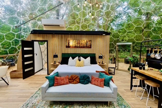 Walking through the glass door, you realize there are no walls dividing you from the forest view. The dome is one open studio with a separate bathroom, and everything inside feels upscale.